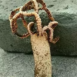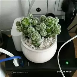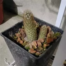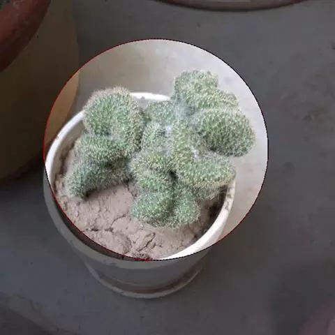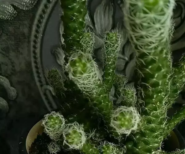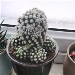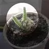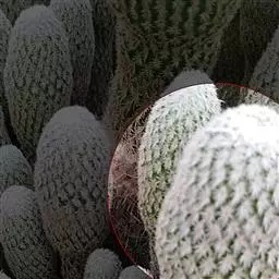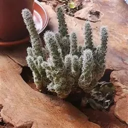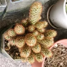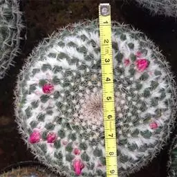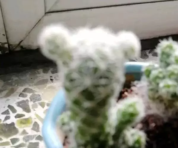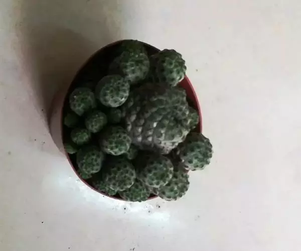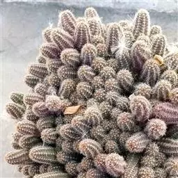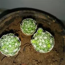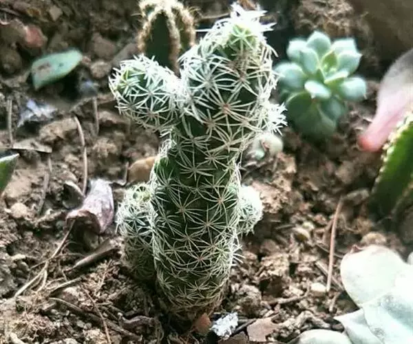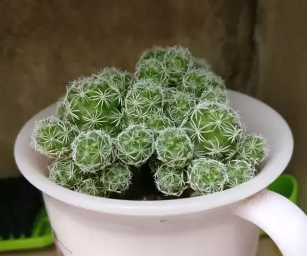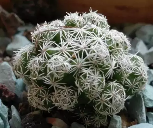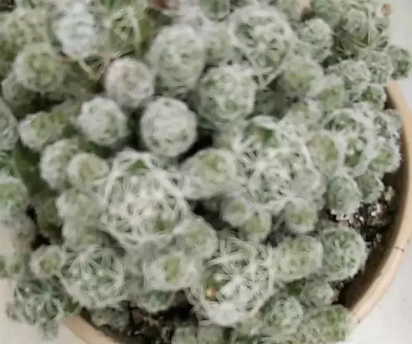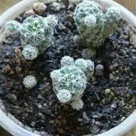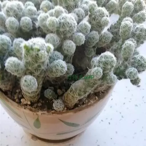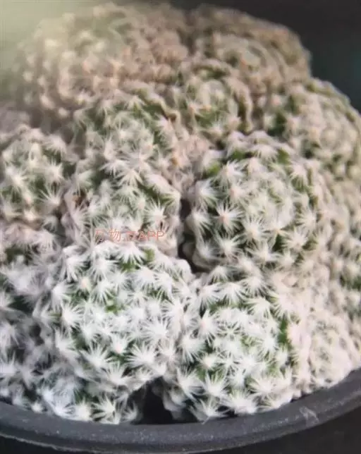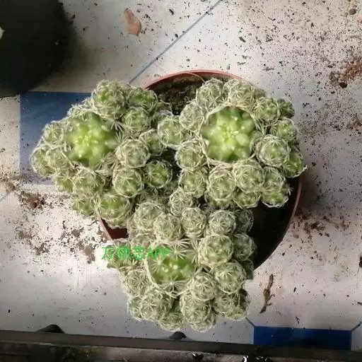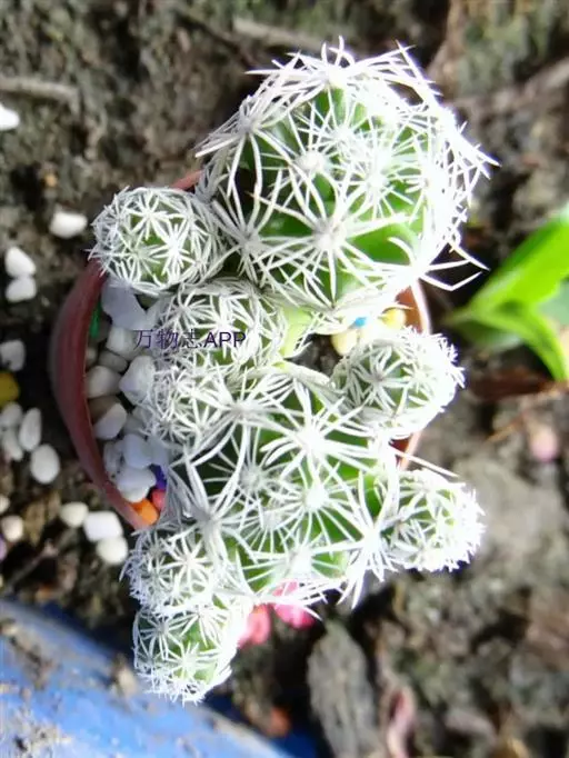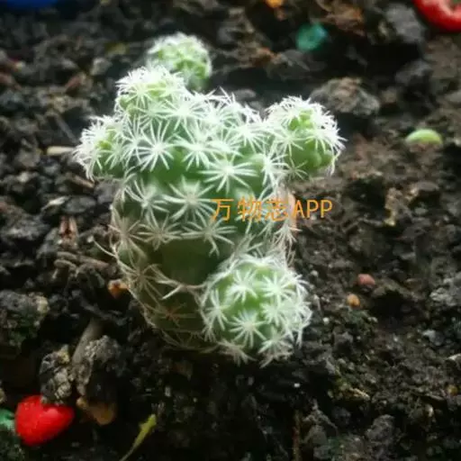 仙人掌科乳突球属,植株群生,小短圆筒形。单体球径2~3cm,体色灰绿色。白色刚毛样短小周刺12~15枚;白色细针样中刺1枚。春季侧生小型淡黄色钟状花,花径约1cm。