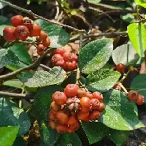 缘有细锯齿,表面绿色,幼叶红色,鲜艳可爱。初夏开花,白色,复伞房花序。小梨果球形,熟时红色,缀满枝头,极为美丽。叶片革质,长椭圆形,顶端尾尖,边缘有带腺的细锯齿,近基部全缘,幼叶红色,后渐变为绿色而具光泽。花小,白色,成顶生复伞房花序。梨果近球形,红色。