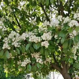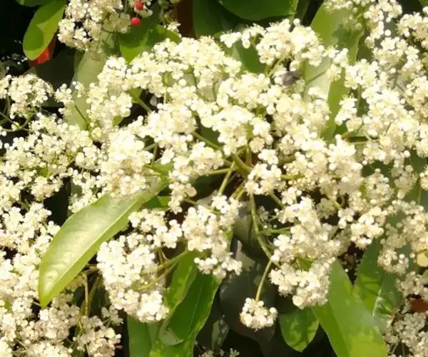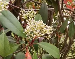 石楠花,学名Photinia serrulata Lindl.,英文名称为Photinia,别名千年红、扇骨木等。蔷薇科石楠属常绿灌木或小乔木,原产于中国。花期4—5月,果期10月。圆形树冠,叶丛浓密,嫩叶红色,花白色、密生,冬季果实红色,鲜艳著目,是常见的栽培树种;木材坚密,可制车轮及器具柄;叶和根供药用为强壮剂、利尿剂,有镇静解热等作用;又可作土农药防治蚜虫,并对马铃薯病菌孢子发芽有抑制作用;种子榨油供制油漆、肥皂或润滑油用;可作枇杷的砧木,用石楠嫁接的枇杷寿命长,耐瘠薄土壤,生长强壮。