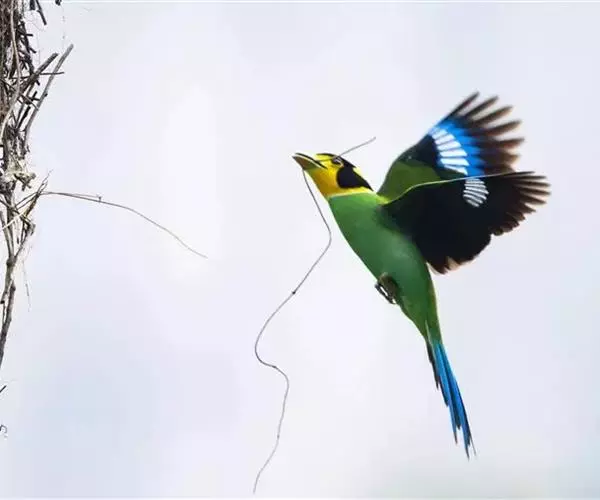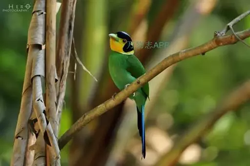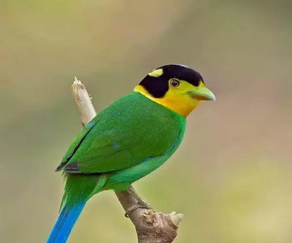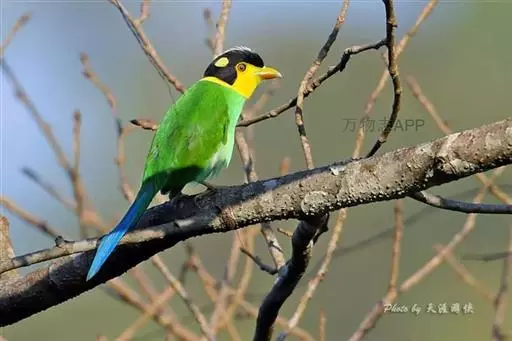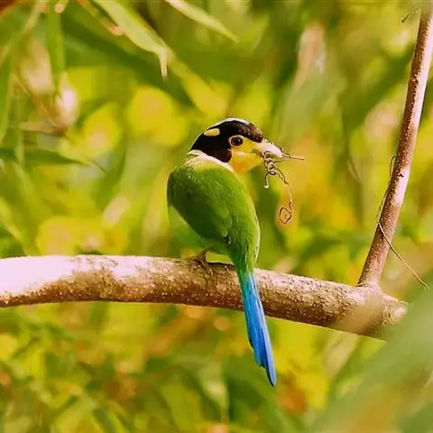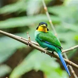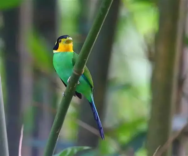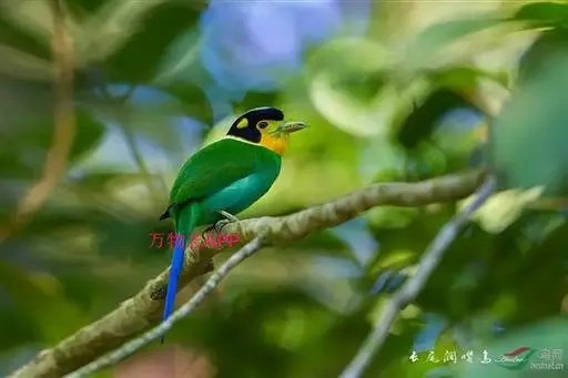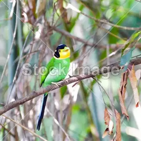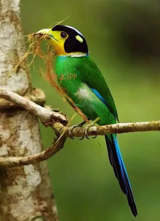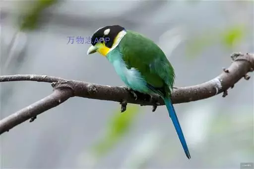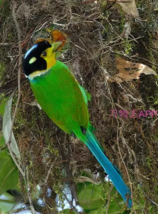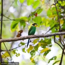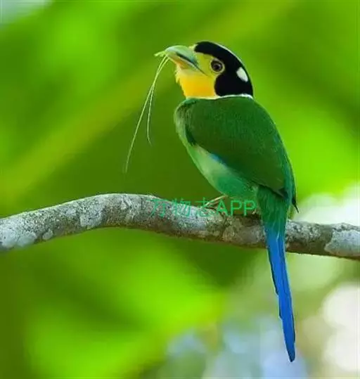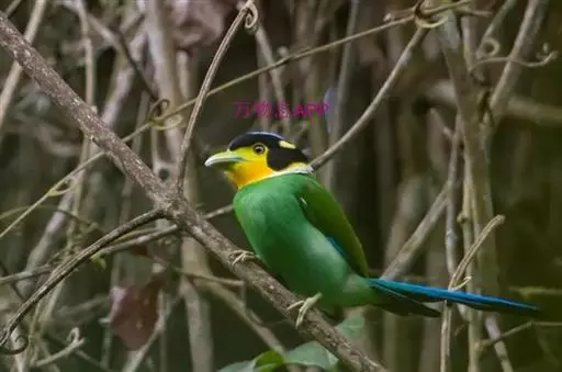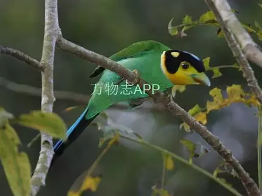 长尾阔嘴鸟是雀形目阔嘴鸟科的鸟类,体长约25厘米,是绿色阔嘴鸟。形长的楔形尾蓝色,喉及脸黄色,顶冠…