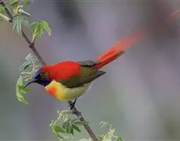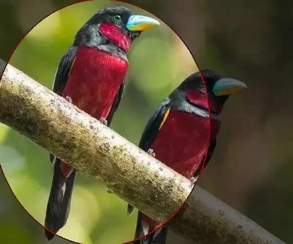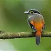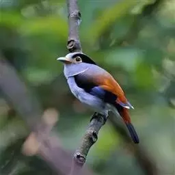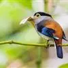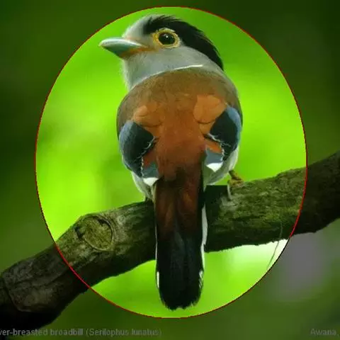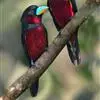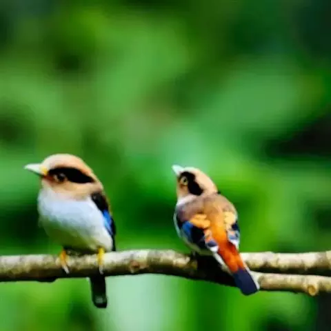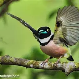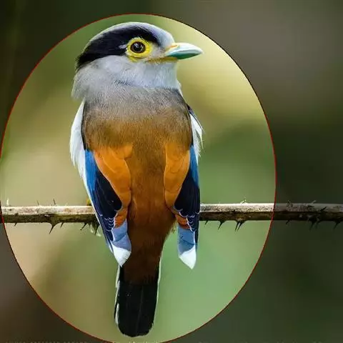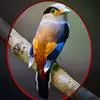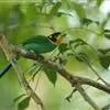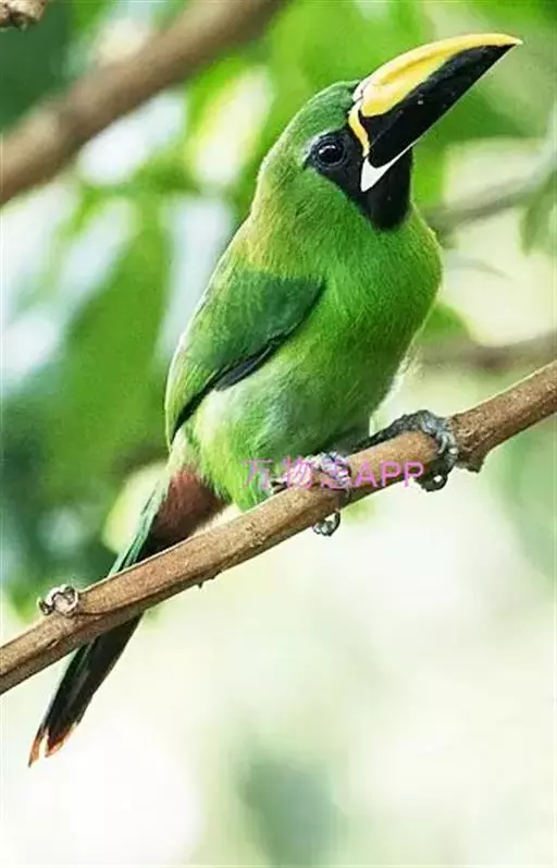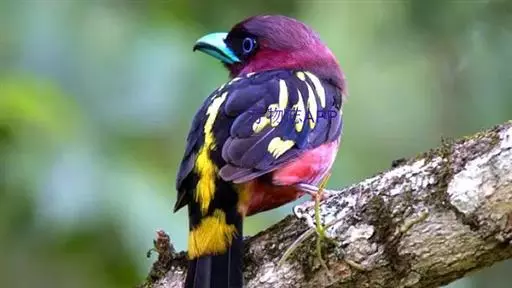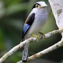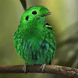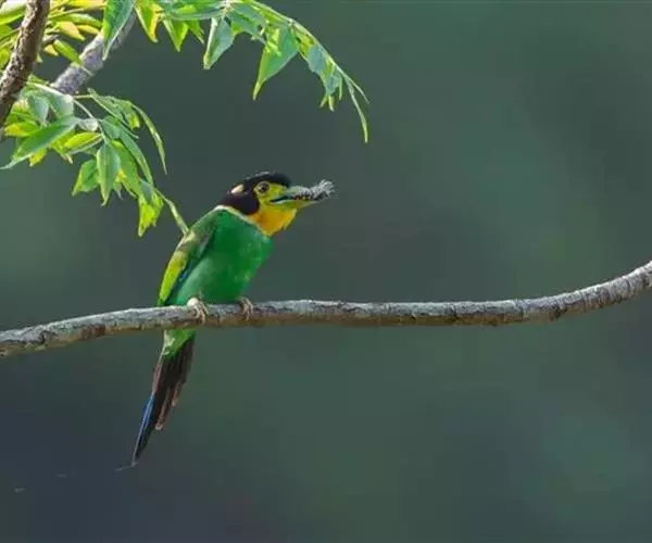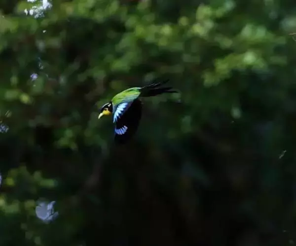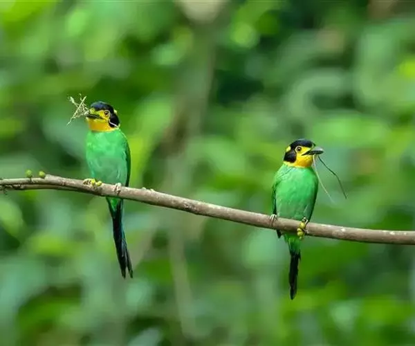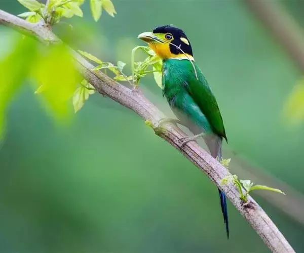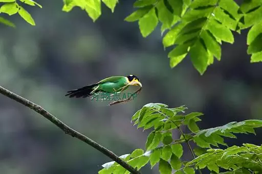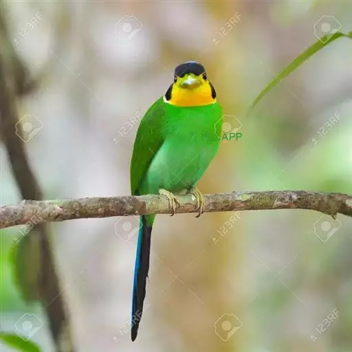 长尾阔嘴鸟是雀形目阔嘴鸟科的鸟类,体长约25厘米,是绿色阔嘴鸟。形长的楔形尾蓝色,喉及脸黄色,顶冠…