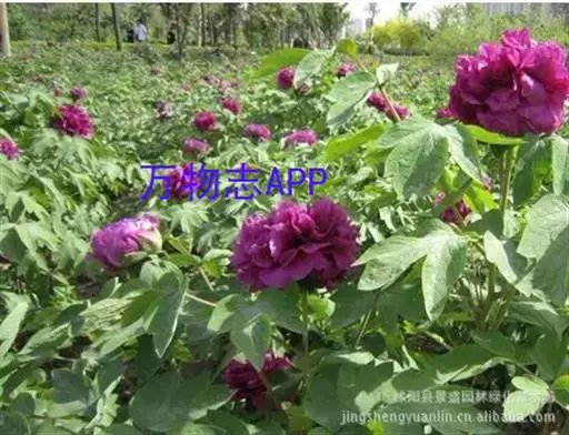 洛阳红(学名:Paeonia suffruticosa cv. 'Luoyang Red'):牡丹品种,落叶灌木。株型高,直立。分枝较细而硬。叶宽卵形,表面绿色,无毛,背面淡绿色,有时具白粉,沿叶脉疏生短柔毛或近无毛。花单生枝顶,苞片5,长椭圆形,大小不等;萼片5,绿色,宽卵形,大小不等;花朵蔷薇型。花蕾圆尖形。花紫红色,有光泽。花丝上部白色,花药长圆形,花盘革质,杯状,紫红色;心皮5,密生柔毛。蓇葖长圆形,密生黄褐色硬毛。花期5月;果期6月。