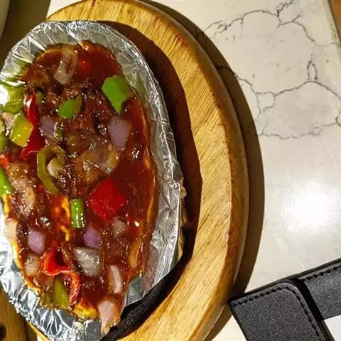 7.最后,倒入青椒、红椒和洋葱,快速翻炒后盛起。