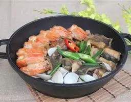 1.青菜和金针菇洗净,把各类丸子放入开水中解冻,稍软时沥干捞出;干豆腐切 粗丝,葱姜蒜切大块大片,粗犷一些,鲜虾要过油(油炸到黄红)。