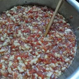 锅中放两勺油(和平时炒菜差不多就好),油烧热后,将剁碎的豆瓣酱下锅煸炒,炒出红油