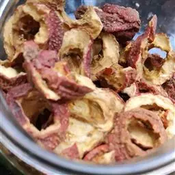 4、 将干辣椒的表面用湿毛巾擦干净,剪成段,辣椒籽不要,如果使用那种灯笼椒也可 以不剪。