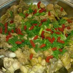 10、 将事先炸 过的干辣椒放入一起炒。加入糖、盐(视情况,豆瓣、火锅调料里都有盐)、鸡精(依各人口味)调味,炒匀即可,用大碗盛出洒上芝麻和香菜即可。