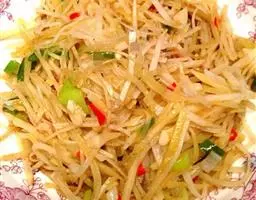 醋熘三丝是以土豆、青椒等为主要食材制作的美食。