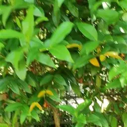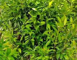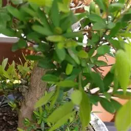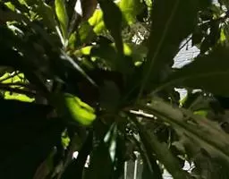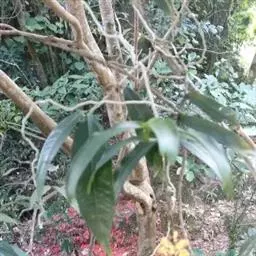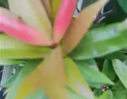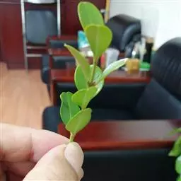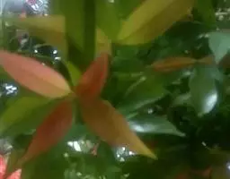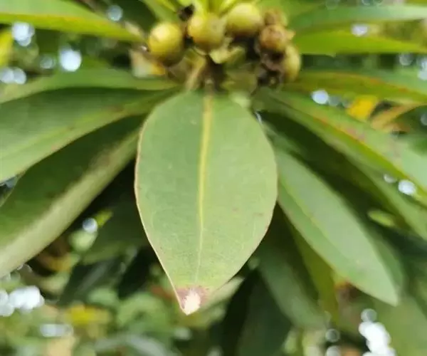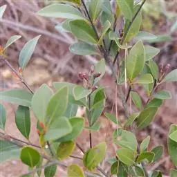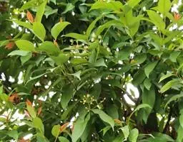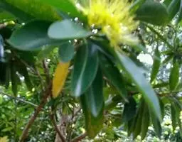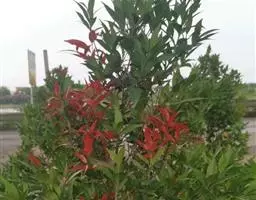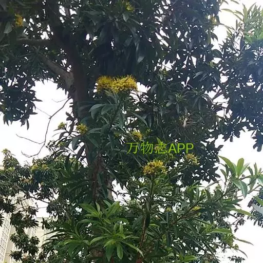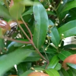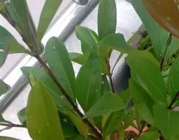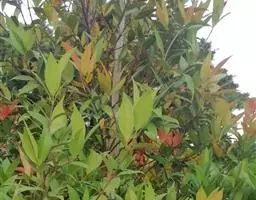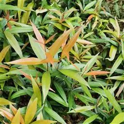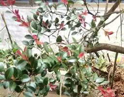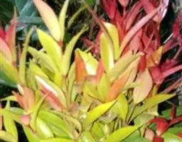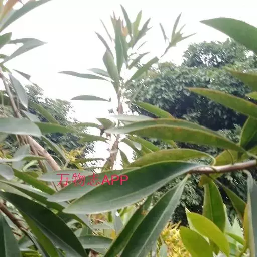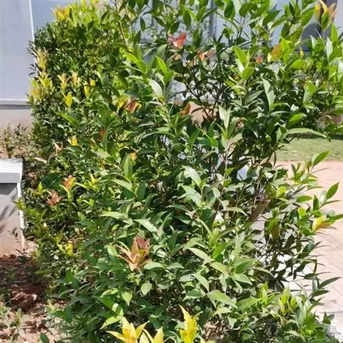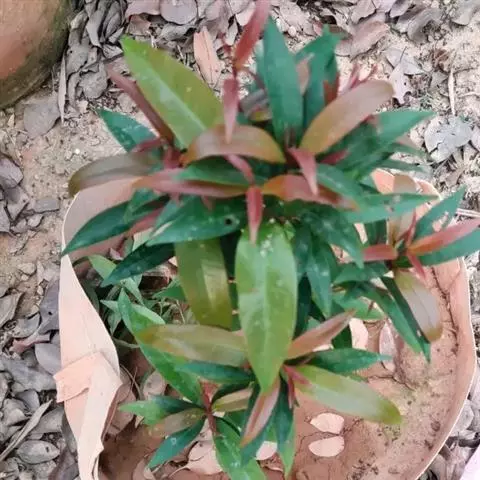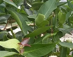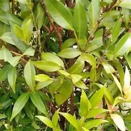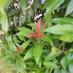常绿乔木,株形挺拔,主干明显,6年生植株树高可达5米。叶色亮绿,叶对生、互生或丛生枝项,披针形,全缘,革质,叶表光滑,新叶带有红色,揉搓有番石榴气味。