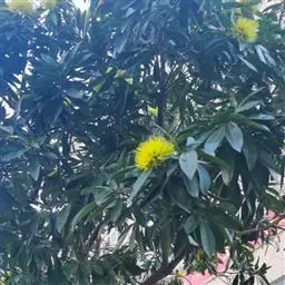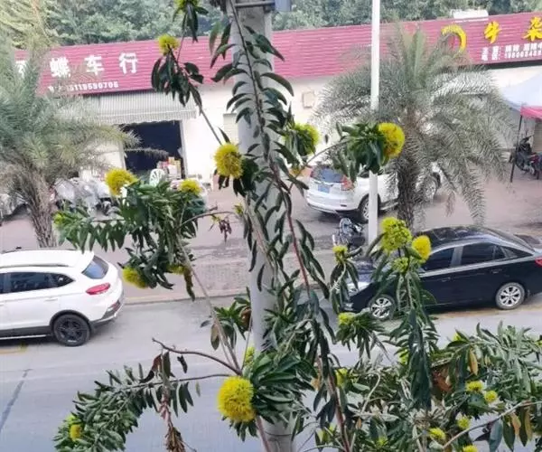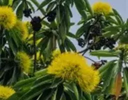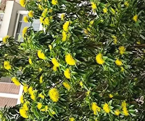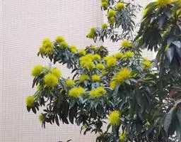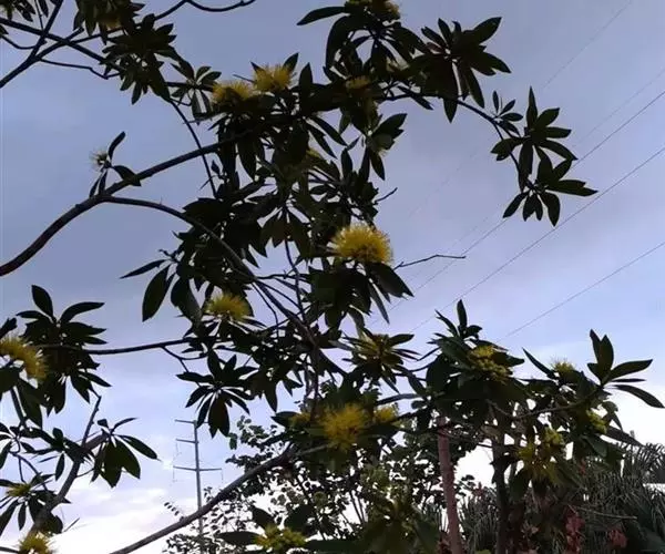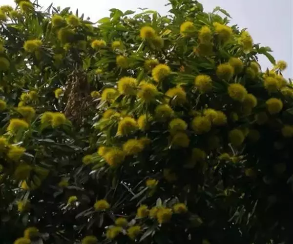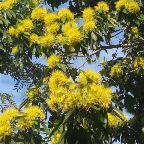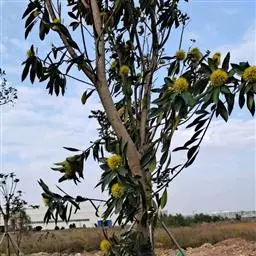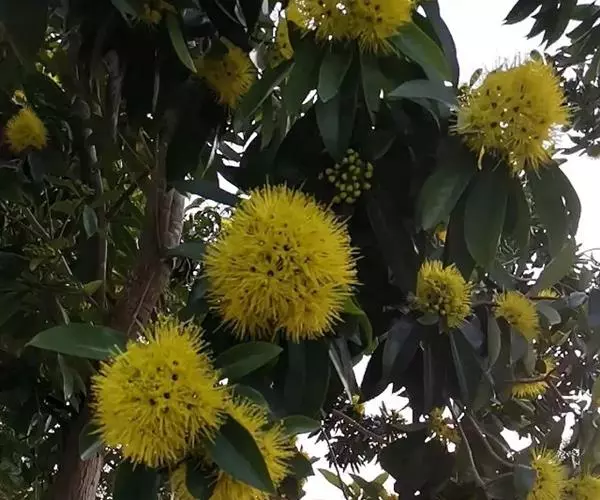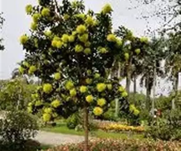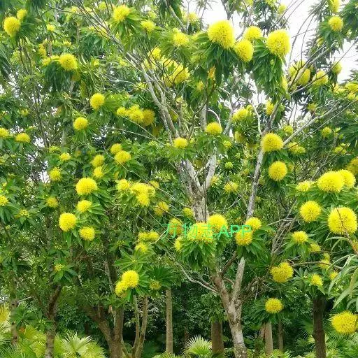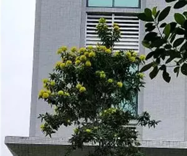 花初开时黄绿色,随着开花时间延长,转为黄色,凋谢时为金黄色,其鲜黄色的小花聚生在枝条的顶端,排成伞房花序,整团花序远观有如绒球,远看仿佛一个个憨态可掬的熊猫脸,故称为“金黄熊猫”,是花色特殊的珍奇花木。树形优美,木质坚硬,适宜作园景树木、行道树以及房前屋后等非规划林地造林,幼株可盆栽,具有较高的绿化景观和经济开发价值。