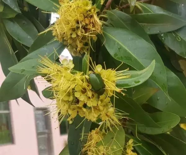 全年有花,盛花期为每年11月到次年2月,总状花序有花4-7朵,生于枝顶叶腋或苞腋,常7-13个花序组成密集的团簇状。花黄色,花萼与花瓣各5枚,倒卵形,花柱单一。开花后易结果,蒴果杯状球形,成熟时3-4裂。种子棕褐色,类三角形、肾形,扁平。