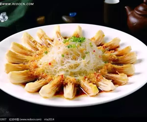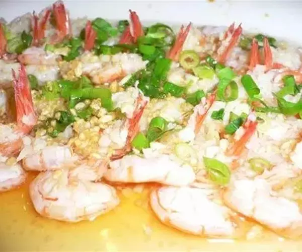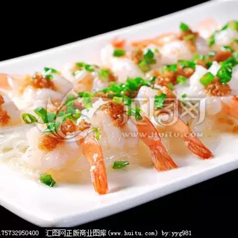 2、将虾放入碗内,加盐、胡椒粉、蒜茸、粉丝腌好,入笼蒸熟。