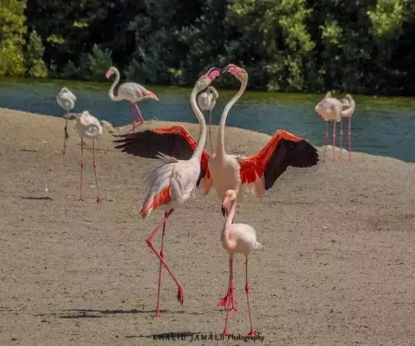 火烈鸟与雁类相似的叫声此起彼伏,震耳欲聋,远远望去,红腿如林,一条条长颈也频频交替蠕动,十分壮观。它们性情温和,平时显得胆怯而机警,游泳的技术也很出色。飞翔时,能把颈部和两腿伸长呈一条直线,而且只要有一只飞上天空,就会有一大群紧紧跟随,边飞边鸣。