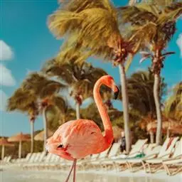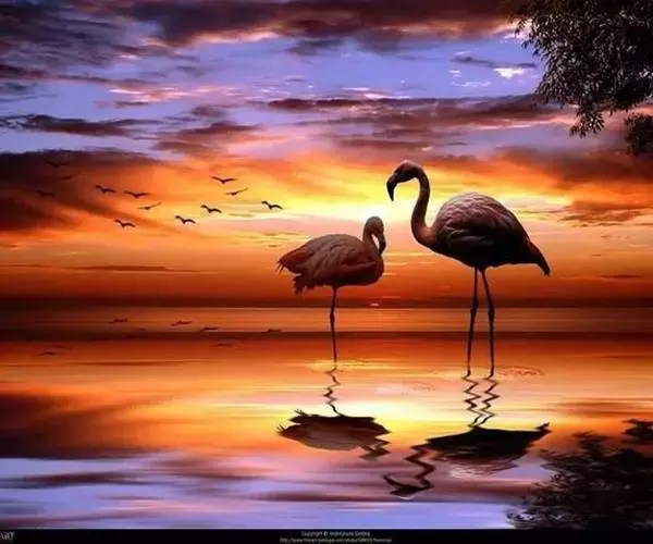 火烈鸟(学名:Phoenicopteridae):亦称红鹳。是鸟纲、红鹳科3属6种鸟类的通称。体高约80-160厘米,体重2.5-3.5千克。体型大小似鹳;嘴短而厚,上嘴中部突向下曲,下嘴较大成槽状;颈长而曲;脚极长而裸出,向前的3趾间有蹼,后趾短小不着地;翅大小适中;尾短;体羽白而带玫瑰色,飞羽黑,覆羽深红,诸色相衬,非常艳丽。