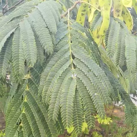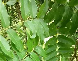 托叶早落。叶长10-20厘米,无毛,有小叶4-5对;小叶革质,无毛,卵形、长卵形或椭圆状披针形,长6-12厘米,宽3.5-6厘米,两侧不对称,上侧较狭,下侧较阔,顶端渐尖或短渐尖,基部圆形或阔楔形,边全缘;小叶柄长约,毫米。