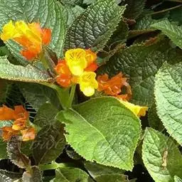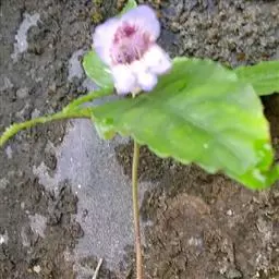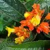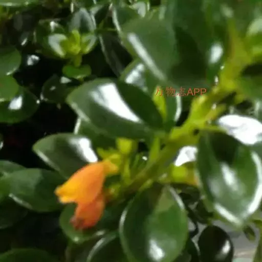 花单生于叶腋,长约2~3㎝,5个萼片,花冠呈唇形,下部膨大,先端5小裂,橙红色,裂片黄色,裂片间红色;雄蕊着生于花瓣上,花药粘连;雌蕊一枚。蒴果,与玄参科植物相似。