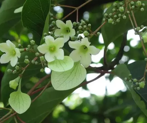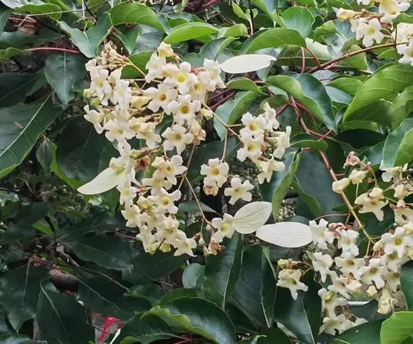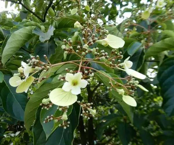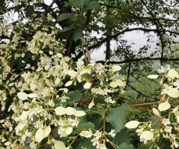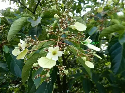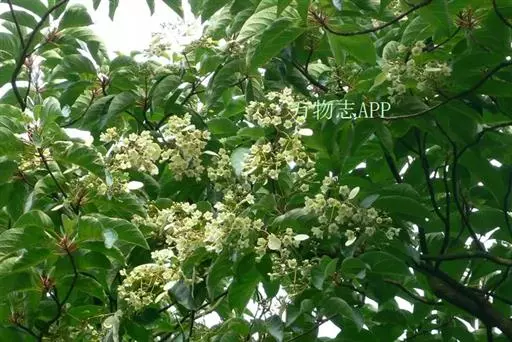 香果树(学名:Emmenopterys henryi Oliv.)是茜草科,香果树属落叶大乔木,高可达30米,树皮灰褐色,鳞片状;小枝粗壮有皮孔,叶纸质或革质,叶片阔椭圆形、阔卵形或卵状椭圆形,上面无毛或疏被糙伏毛,下面较苍白,托叶大,三角状卵形,圆锥状聚伞花序顶生;花芳香,裂片近圆形,变态的叶状萼裂片白色、淡红色或淡黄色,花冠漏斗形,白色或黄色,花丝被绒毛。蒴果长圆状卵形或近纺锤形,种子多数,6-8月开花,8-11月结果。