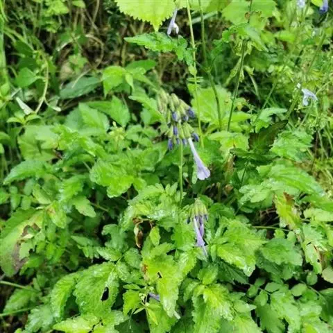 花萼钟形,长1.6-1.9厘米,外被长柔毛,脉上毛更多,明显具深紫色腺点,二唇形,上唇半圆形,长6毫米,宽10毫米,全缘,先端有3短尖头,下唇与上唇等长,半裂为2齿,齿三角形,锐尖。
