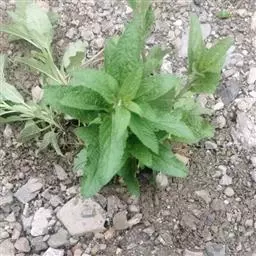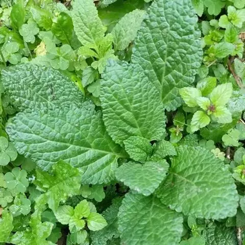 叶有基生叶和茎生叶,茎生叶较少,几全部为基生叶,均具长柄,叶片长圆状戟形或卵状心形,长3.5-9.5厘米,宽2-5.3厘米,先端钝,基部心形或近戟形,边缘有不整齐的圆齿,纸质,两面被微硬伏毛,下面更多,密被深紫色腺点;叶柄长3-17厘米,在下部的最长,向上渐短,被微硬伏毛。