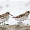 阔嘴鹬是涉禽,体长17厘米。特征为翼角常具明显的黑色块斑并具双眉纹。与黑腹滨鹬平滑下弯的嘴相比,…