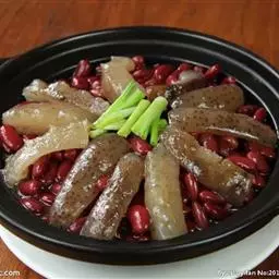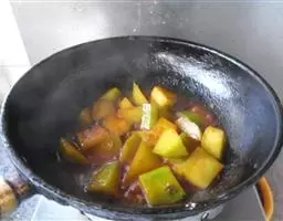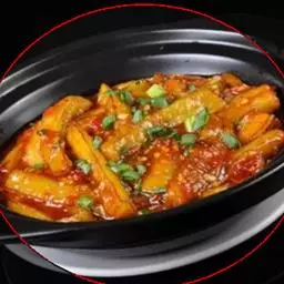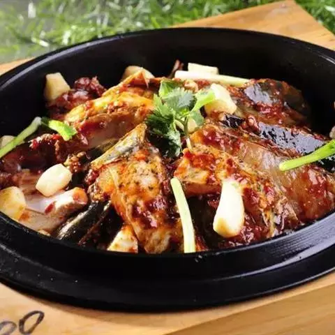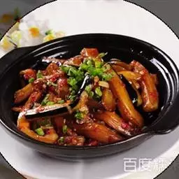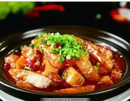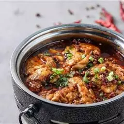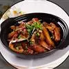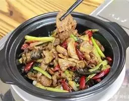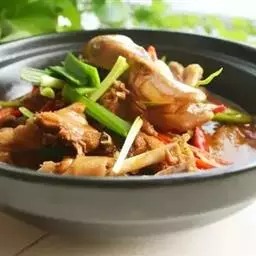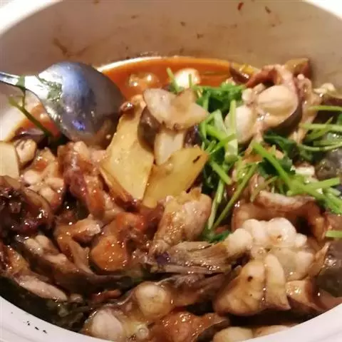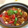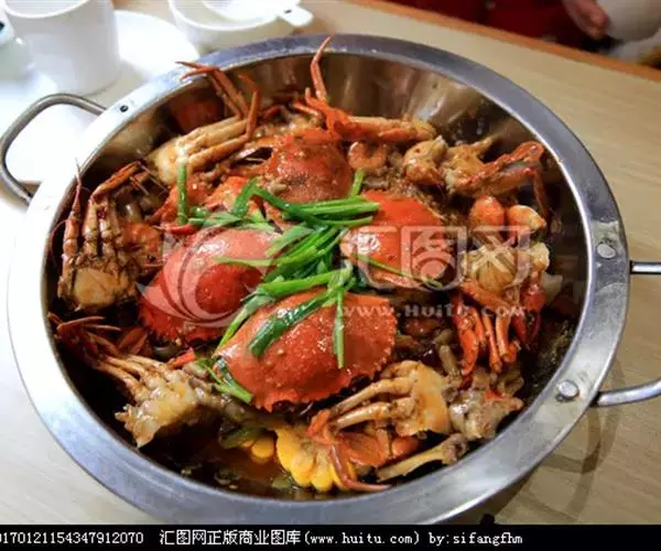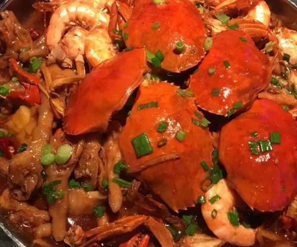 4、热锅凉油,放入少量干辣椒段、麻椒,然后放入蒜片、姜煸香,加辣酱、高汤,倒肉蟹、鸡爪翻炒收汁,装入煲盘撒香葱段即可。
