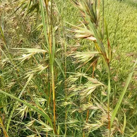 圆锥花序长与宽近相等,为4—8厘米,具疏散分枝,基部为顶生叶鞘所包藏;小穗含1小花,颖不存在,外稃长6—8毫米,草质,具5脉,脉上被纤毛,脉间生短毛,顶端具长l一2厘米的芒,基部有长约1厘米的柄状基盘;内稃与其外稃同质且等长,具3脉,中脉被纤毛,顶端尖;鳞被2,具脉;雄蕊6,花药黄色,长3—3.5毫米。秋季开花。染色体 水禾 2n=24(HiragoshulShu1937)。