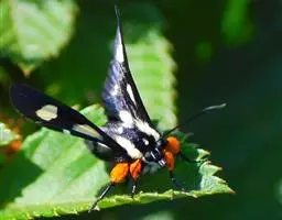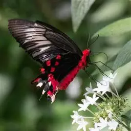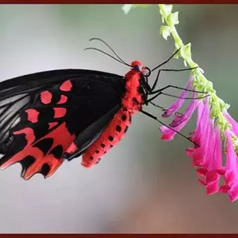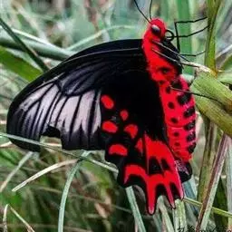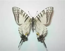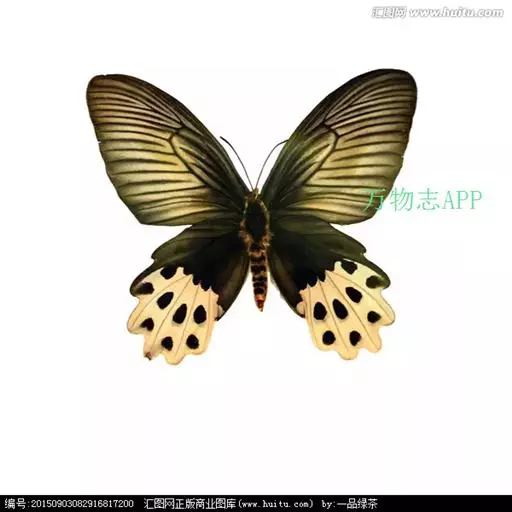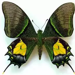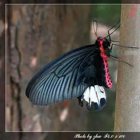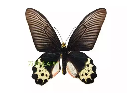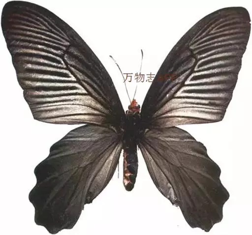 成虫:翅展115 mm左右。体背黑色,两侧红色。翅黑褐色,脉纹两侧灰色;雄蝶后翅狭窄,亚外缘有3个齿状白斑,外缘波状。雌蝶翅较阔,后翅亚外缘的白斑发达,阔而数目增加,扩展到前缘及内缘,有时这些大白斑中心有黑圆斑。翅反面色淡,白斑扩大、色淡,近前缘另有1个小白斑;其余与正面相似。雄性外生殖器上钩突上下等宽,骨化程度强;尾突长而具毛,中间膜质相连。抱器瓣宽大于长,抱器端稍窄,两侧有2个角突是抱器腹和抱器背的延伸形成的;抱器腹弧形,内突形成2个大角突。囊形突长半圆形。阳茎极粗。雌性外生殖器产卵瓣半圆形,具少数强刺;交配孔宽大,中间有舌形骨化的突起;前阴片强度骨化,两侧略呈刀片状,中部呈双马蹄形。囊导管宽短,膜质;交配囊大;囊突很长,几乎与交配囊等长,两端细柄状,中后部宽,由小突起构成有规律的褶痕。寄主 马兜铃科Aristolochiaceae的植物。