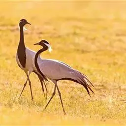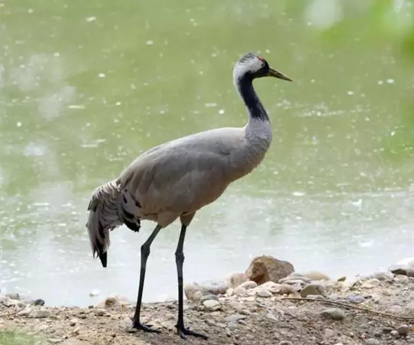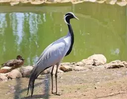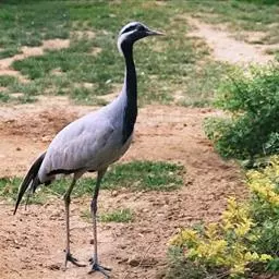 蓑羽鹤大型涉禽,体长68~92厘米,是鹤类中个体最小者。通体蓝灰色,眼先、头侧、喉和前颈黑色,…