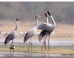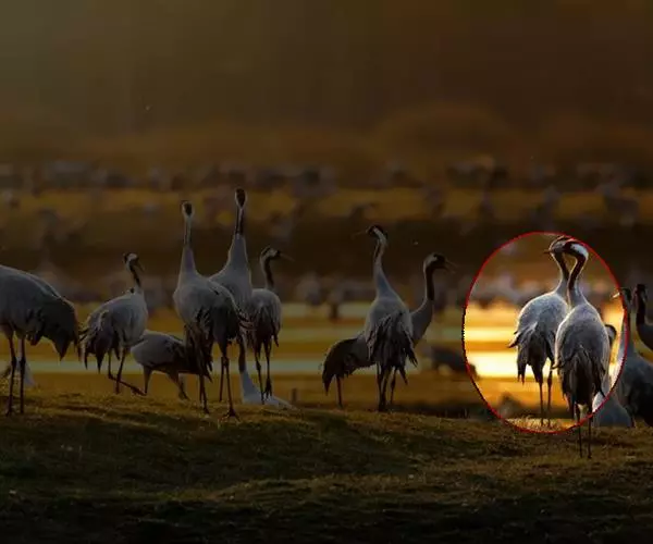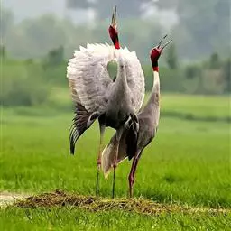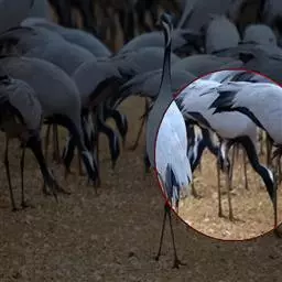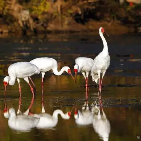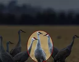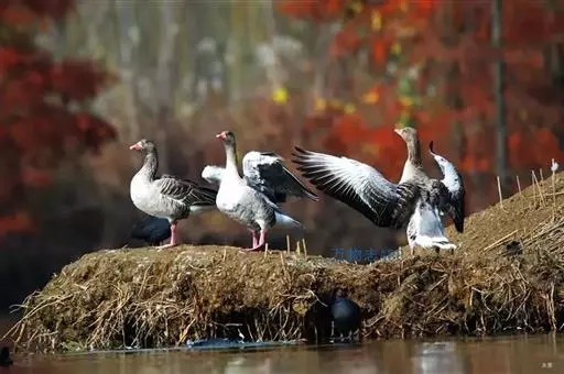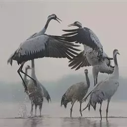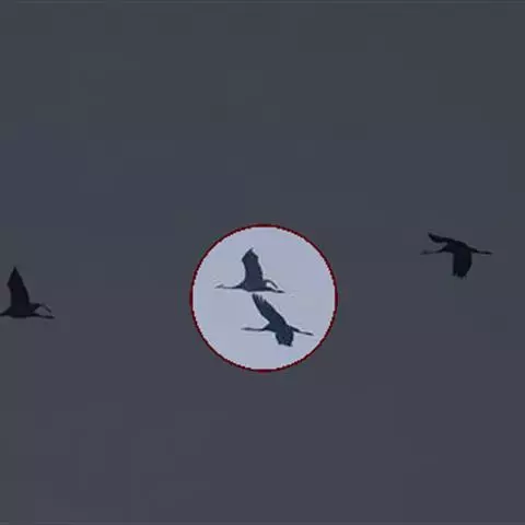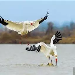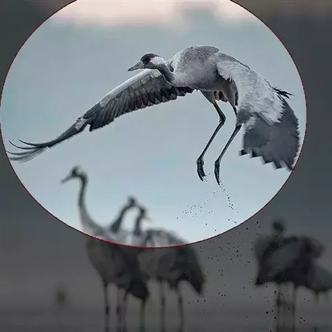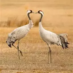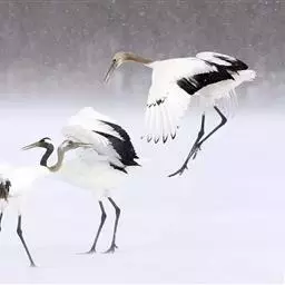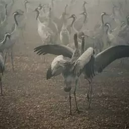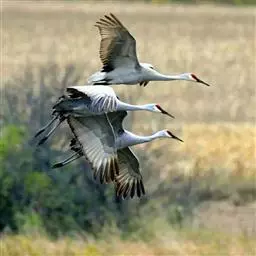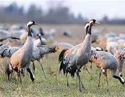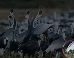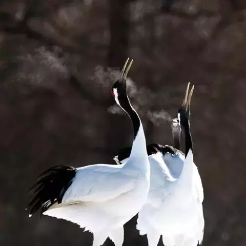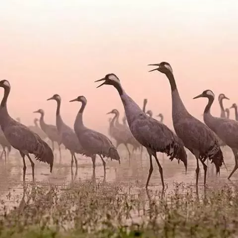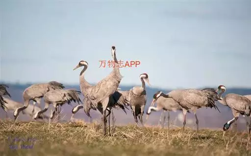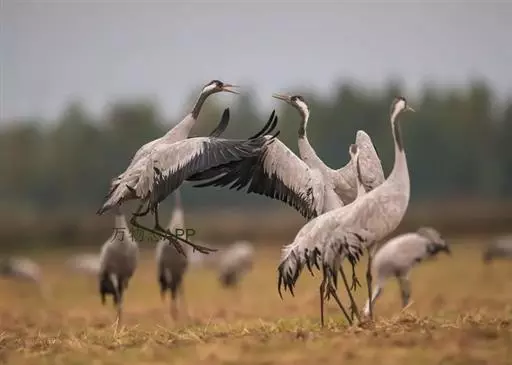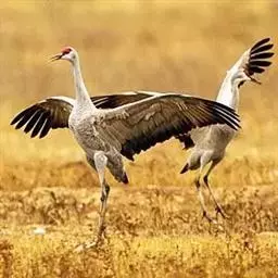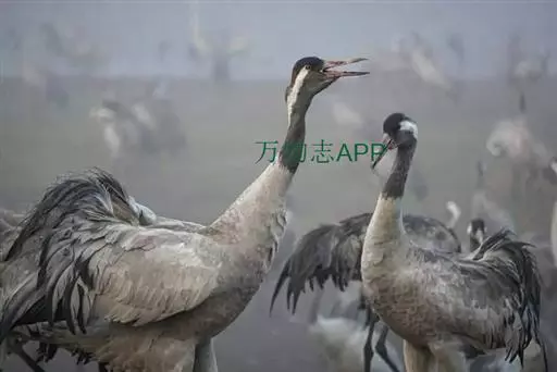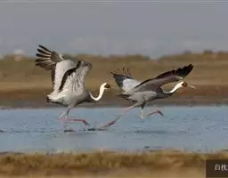 灰鹤 灰鹤成5-10余只的小群活动,迁徒期间有时集群多达40-50只,在冬天越冬地集群个体多达数百只。性机警,胆小怕人。活动和觅食时常有一只鹤担任警戒任务,不时的伸颈注视四周动静,发现有危险,立刻长鸣一声,并振翅飞翔,其他鹤亦立刻齐声长鸣,振翅而飞。飞行时排列成‘V’字或‘人’字形,头、颈向前伸直,脚向后直伸。栖息时常一只脚站立,另只脚收于腹部。