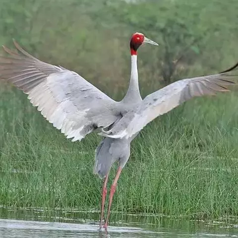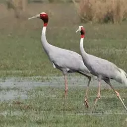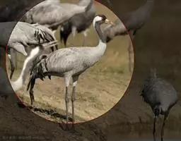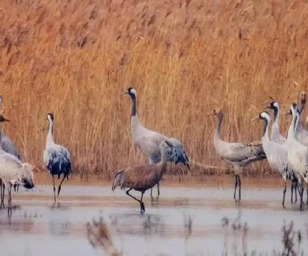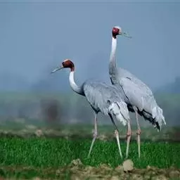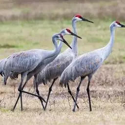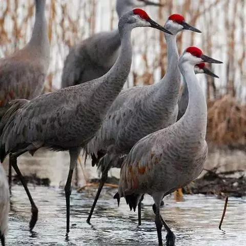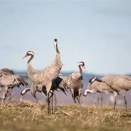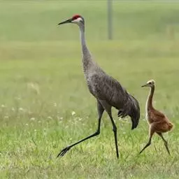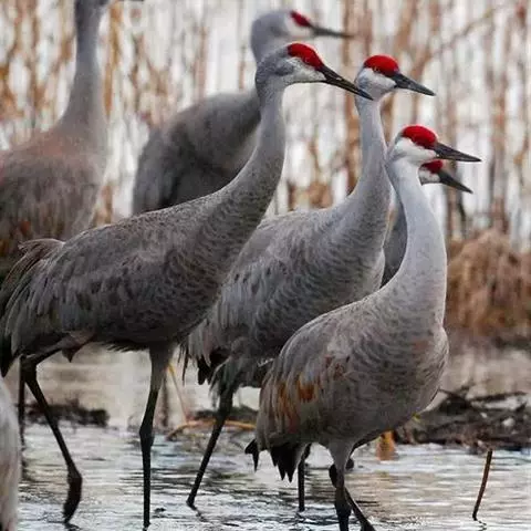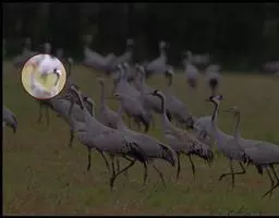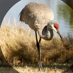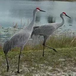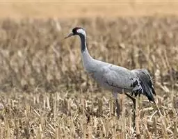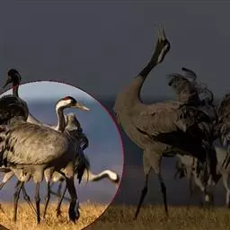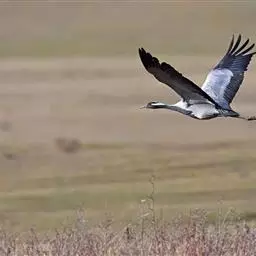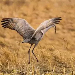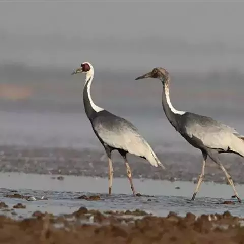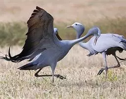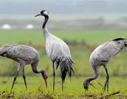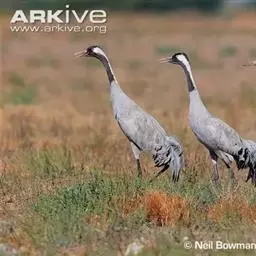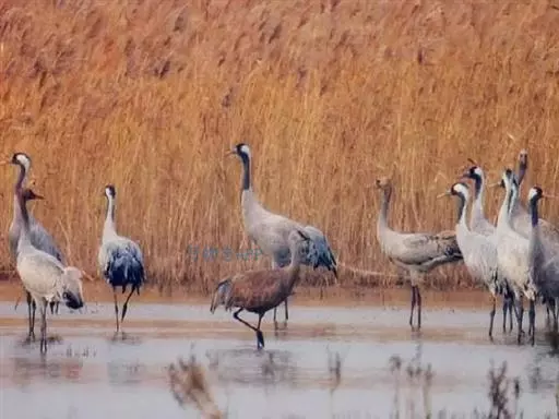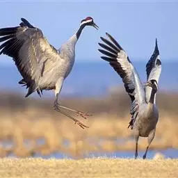 灰鹤(学名:Grus grus)是大型涉禽,体长100-120厘米。颈、脚均甚长,全身羽毛大都灰色,头顶裸出皮肤鲜红色,眼后至颈侧有一灰白色纵带,脚黑色。栖息于开阔平原、草地、沼泽、河滩、旷野、湖泊以及农田地带;其中尤为喜欢以富有水边植物的开阔湖泊和沼泽地带。主要以植物叶、茎、嫩芽、块茎、草子、玉米、谷粒、马铃薯、白菜、软体动物、昆虫、蛙、蜥蜴、鱼类等食物为食。春季于3月中下旬开始往繁殖地迁徙,秋季于9月末10月初迁往越冬地。迁徙时常为数个家族群组成的小群迁飞,有时也成40-50只的大群,繁殖期4-7月。每窝通常产卵2枚,雌雄轮流孵卵,孵化期28-30天。在世界范围内,繁殖在欧亚大陆北部;其越冬地在法国,阿拉伯半岛,非洲西北部和东北部,中东,巴基斯坦,印度以及中国的东部和南部,偶见于朝鲜半岛,日本和北美西部。越冬在非洲北部、伊朗、印度、缅甸和中南半岛北部。