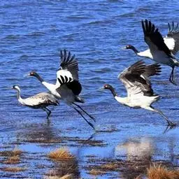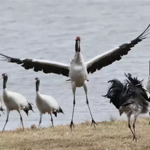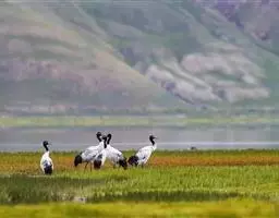 黑颈鹤:是鹤科、鹤属的大型涉禽,体长110-120厘米,体重4-6千克。颈、脚甚长,通体羽毛灰白色,…