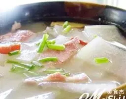 3、把牛肉切片,火腿切片,小泥肠半根切片用牛肉汤煨制。