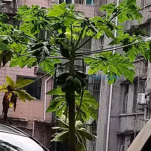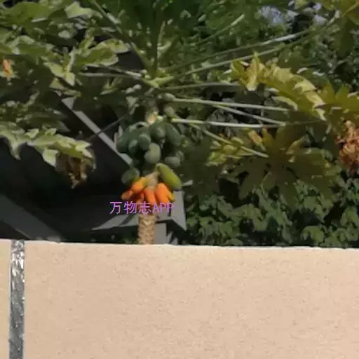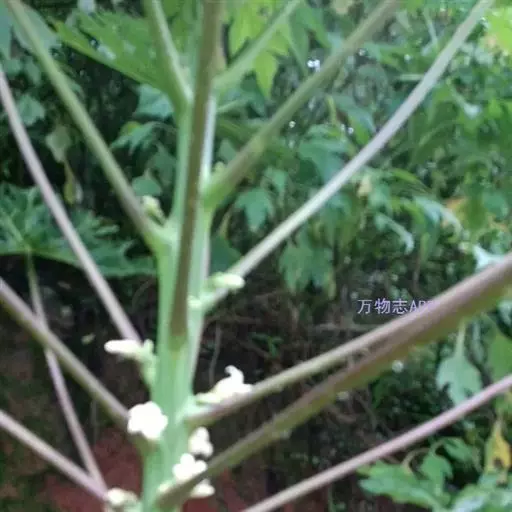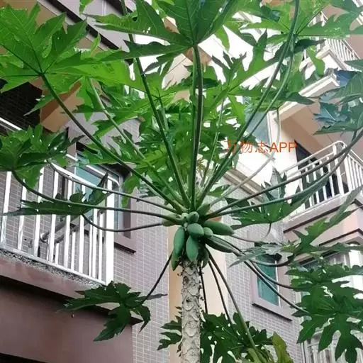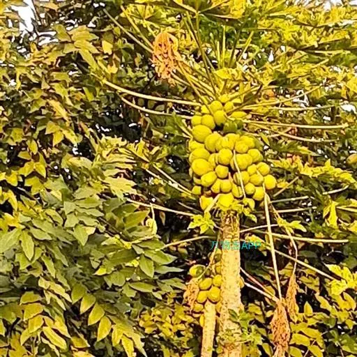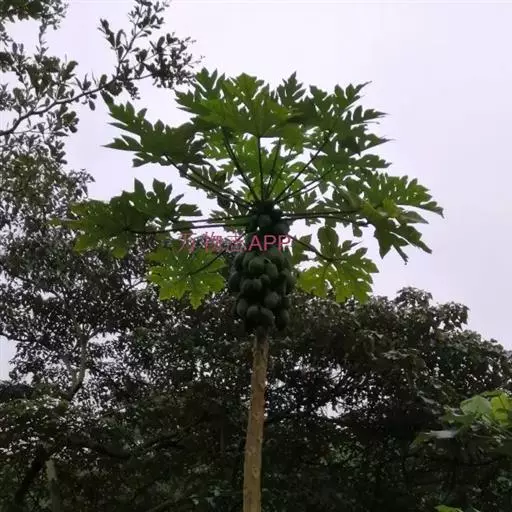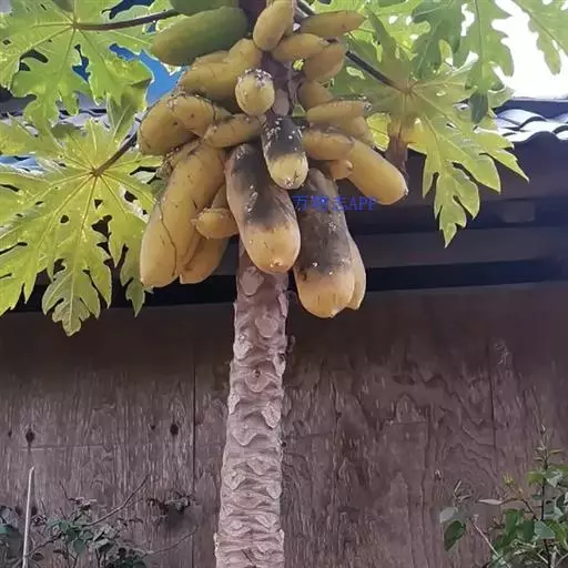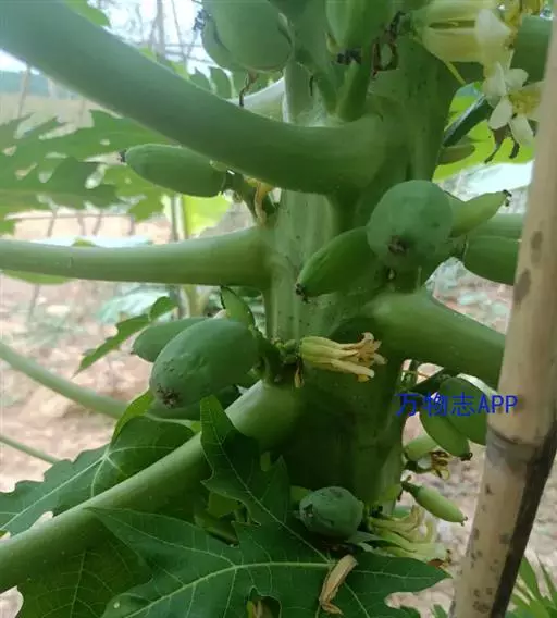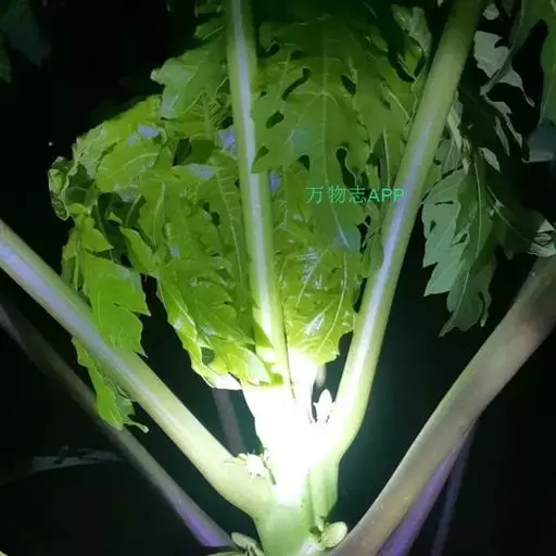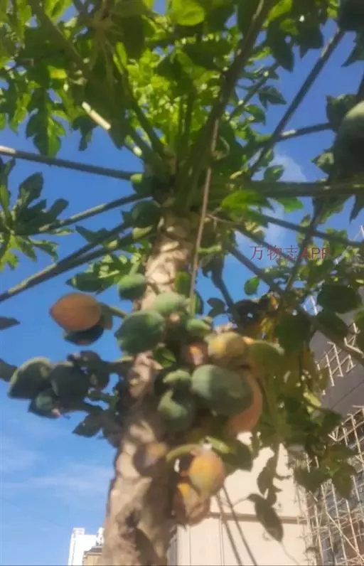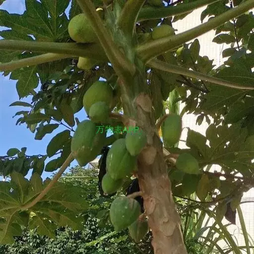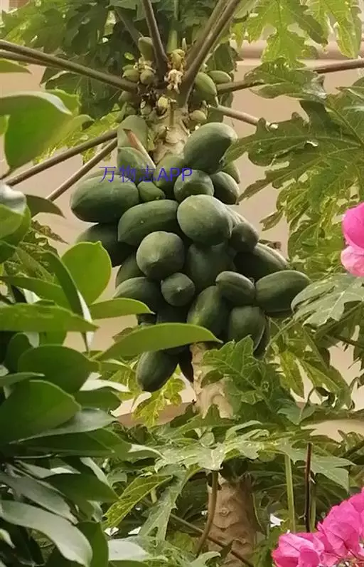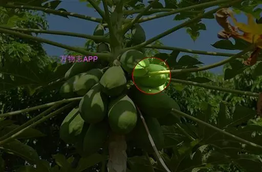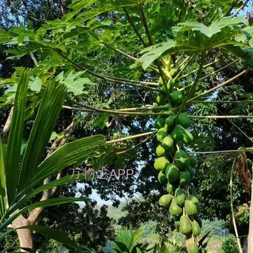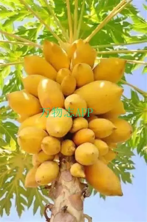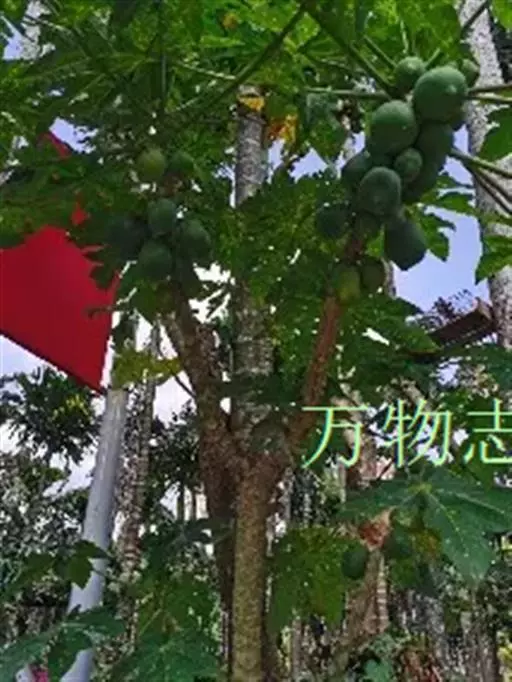 番木瓜(Carica papaya L.)又称木瓜、乳瓜、万寿果,为热带、亚热带常绿软木质小乔木,高达8-10米,具乳汁;茎不分枝或有时于损伤处分枝,具螺旋状排列的托叶痕。果实长于树上,外形像瓜,故名之木瓜。番木瓜的乳汁是制作松肉粉的主要成份。花果期全年。