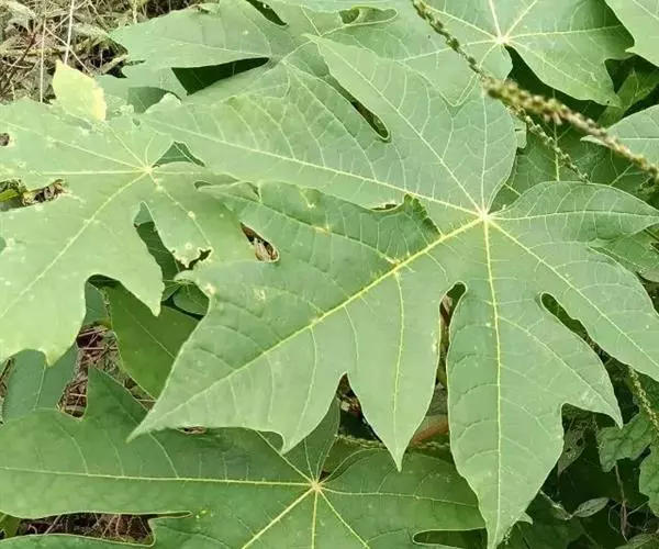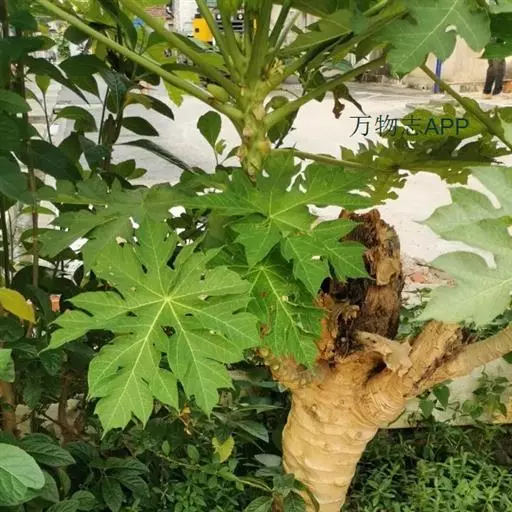 叶大,聚生于茎顶端,近盾形,直径可达60厘米,通常5-9深裂,每裂片再为羽状分裂;叶柄中空,长达60-100厘米。 番木瓜