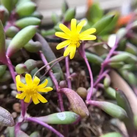 金玉菊又名白金菊,原产非洲南部,为菊科千里光属多年生常绿草本植物。植株匍匐或攀援向上生长,茎圆,红…