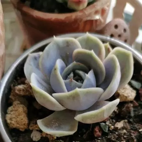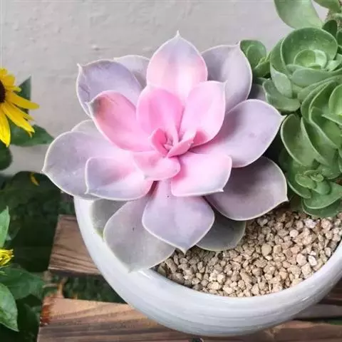 紫珍珠是景天科石莲花属的多年生肉质草本植物。植株中小型;叶片肉质,匙形,呈莲座状紧密排列;叶片粉紫色,…