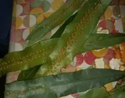 孢子囊群孢生于侧脉分叉处,靠近中脉,有隔丝,囊托突起,囊群盖球形,膜质;囊群盖球形,薄膜质,外侧开裂,易破,成熟时反折覆盖于主脉上面。