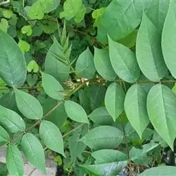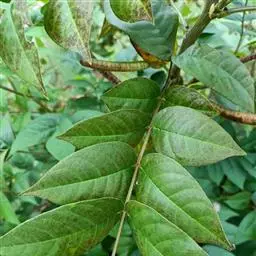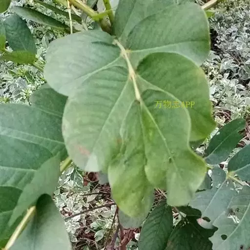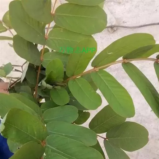 叶长30-60cm;在靠腹面的叶柄和叶轴上有二条纵棱条,有狭翅,托叶三角形;小叶6-12对,薄革质,倒卵状长圆形或长圆形,长8-15cm,宽3.5-7.5cm,顶端圆钝而有小短尖头,基部斜截形,下面叶脉明显凸起;小叶柄极短或近无柄。