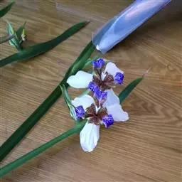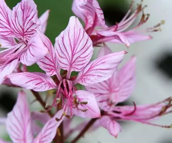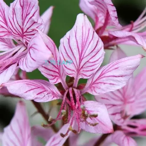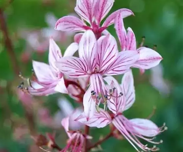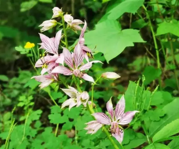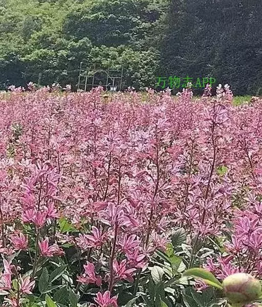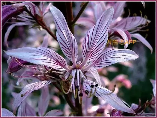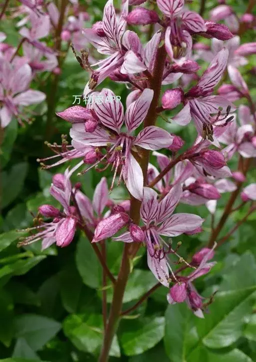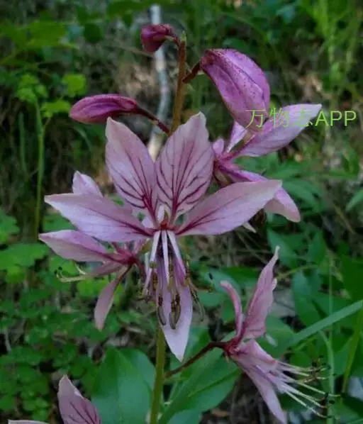总状花序长可达30厘米;花梗长1-1.5厘米;苞片狭披针形;萼片长6-8毫米,宽2-3毫米;花瓣白带淡紫红色或粉红带深紫红色脉纹,倒披针形,长2-2.5厘米,宽5-8毫米;雄蕊伸出于花瓣外;萼片及花瓣均密生透明油点。