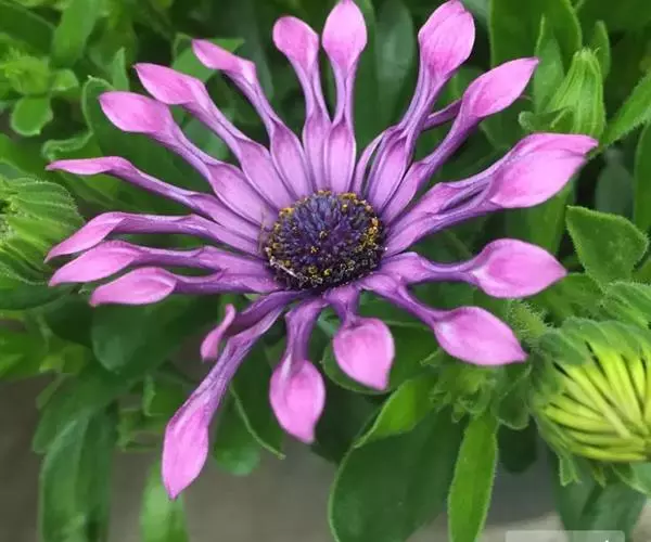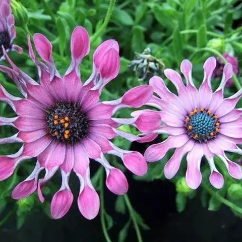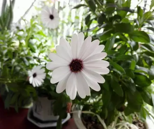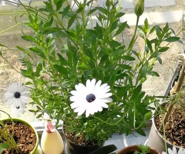 经常会和南非万寿菊混淆,区别是 1、蓝目菊的叶子通常羽状分裂,而南非万寿菊(蓝眼睛)一般不分裂。2、花朵 蓝目菊的花心,即所谓管状花部分,只有蓝色,南非万寿菊(蓝眼睛)有蓝色、黄色及紫色,一般说来,在蓝目菊属中,耐寒性的种类则会在中央呈深蓝色;缘花部分(舌状花),蓝目菊只有白色一种,而南非万寿菊(蓝眼睛)多呈紫、粉、白、黄等色。