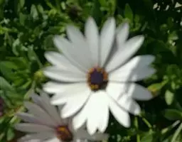 蓝目菊株高一般在60cm以下。基生叶丛生,茎生叶互生,长圆形至倒卵形,通常羽裂,全缘或少量锯齿,叶面幼嫩时有白色绒毛。花径7.5㎝左右,舌状花白色,先端尖 ,背面淡紫色,盘心蓝紫色。有单瓣、重瓣之分。花期夏秋季。