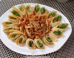 【制法】 1.选用黄豆制作的白色方豆腐干(方干要求质地细腻,压制紧密),先片成厚0.15厘米的薄片,再切成细丝,然后放入沸水中浸烫,用筷子轻轻翻动拨散,沥去水,再用沸水浸烫2次,每次约两分钟捞出,用清水漂洗后再沥干水分,即可去其黄泔水的苦味。 2.炒锅上旺火,舀入熟猪油25克,烧熟,放入虾仁炒至乳白色,起锅盛入碗中。 3.锅中舀入鸡汤,放干丝。再将鸡丝、肫肝、笋放入锅内一边,加虾子、熟猪油55克置旺火上烧约15分钟。待汤浓厚时,加白酱油、精盐。盖上锅盖烧约5分钟离火,将干丝盛在盘中,然后将肫、肝、笋、豌豆苗分放在干丝的四周,上放火腿丝、虾仁即成。