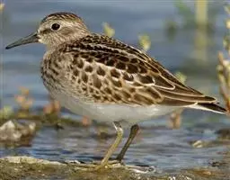 阔嘴鹬是涉禽,体长17厘米。特征为翼角常具明显的黑色块斑并具双眉纹。与黑腹滨鹬平滑下弯的嘴相比,…