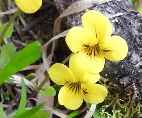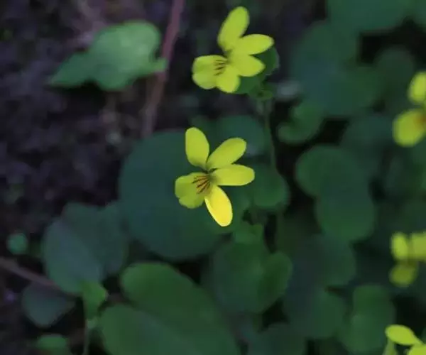 双花堇菜又名:孪生堇菜,短距黄花堇菜。多年生草本。根状茎细或稍粗壮,垂直或斜生,具结节,有多数细根。地上茎较细弱,高10-25厘米,2或数条簇生,直立或斜升,具3(-5)节,通常无毛或幼茎上被疏柔毛。基生叶2至数枚,具长4-8厘米的长柄,叶片肾形、宽卵形或近圆形,长1-3厘米,宽1-4.5厘米,先端钝圆,基部深心形或心形,边缘具钝齿,上面散生短毛,下面无毛,有时两面被柔毛;茎生叶具短柄,叶柄无毛至被短毛,叶片较小;托叶与叶柄离生,卵形或卵状披针形,长3-6毫米,先端尖,全缘或疏生细齿。花黄色或淡黄色,在开花末期有时变淡白色;花梗细弱,长1-6厘米,上部有2枚披针形小苞片;萼片线状披针形或披针形,长3-4毫米,先端急尖,基部附属物极短,具膜质缘,无毛或中下部具短缘毛;花瓣长圆状倒卵形,长6-8毫米,具紫色脉纹,侧方花瓣里面无须毛,下方花瓣连距长约1厘米;距短筒状,长2-2.5毫米;下方雄蕊之距呈短角状;子房无毛,花柱棍棒状,基部微膝曲,上半部2深裂,裂片斜展,其间具明显的柱头孔。蒴果长圆状卵形,长4-7毫米,无毛。花果期5-9月。