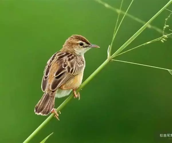 棕扇尾莺(学名:Cisticola juncidis)小型鸟类,体长9~11厘米。上体栗棕色具粗著的黑褐色羽干纹和棕白色眉纹,下背、腰和尾上覆羽黑褐色,羽干纹细弱而不明显,尤其是繁殖季节,腰和尾上覆羽几为纯棕色而无黑褐色纵纹。尾为凸状,中央尾羽最长,暗褐色具棕色羽缘、黑色次端斑和灰色端斑,外侧尾羽暗褐色具棕色羽缘、黑色次端斑和白色端斑。两翅暗褐色,羽缘栗棕色。下体白色,两胁沾棕黄色。相似种金头扇尾莺头顶黄色或金黄色,下体皮黄白色,外侧尾羽端斑窄而不明显,呈棕白色。
