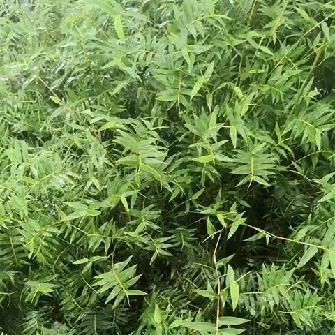 凤尾竹 Raeusch. ex Schult. ’Fernleaf’ R. A. Young)是禾本科,簕竹属孝顺竹的变种。植株较高大,杆高可达6米,竿中空,小枝稍下弯,下部挺直,绿色;竿壁稍薄;节处稍隆起,无毛;叶鞘无毛,纵肋稍隆起,背部具脊;叶耳肾形,边缘具波曲状细长繸毛;叶舌圆拱形,叶片线形,上表面无毛,下表面粉绿而密被短柔毛,小穗含小花,中间小花为两性;外稃两侧稍不对称,长圆状披针形,先端急尖;内稃线形,脊上被短纤毛,花药紫色,子房卵球形,羽毛状。成熟颖果未见。原产中国,华东、华南、西南以至台湾、香港均有栽培。凤尾竹喜温暖、湿润和阳光充足的环境,耐寒。宜土层深厚、肥沃、疏松的微酸性壤土。该种观赏价值较高,宜作庭院丛栽,也可作盆景植物。全草或根入药,味淡、微苦,性寒,有清热利湿、凉血止血、消肿解毒功效,可治痢疾、泄泻等多种病症。凤尾