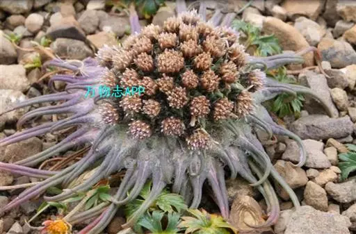 头状花序无小花梗或有长近2毫米的小花梗,多数在莲座状叶丛中密集成半球形的直径为4厘米的总花序。总苞圆柱状,直径6毫米;总苞片5层,外层长椭圆形或长圆形,长7毫米,宽4毫米,顶端急尖,紫红色,外面密被白色长柔毛,中层长圆形,长1.2厘米,宽2.5毫米,顶端圆形,内层长披针形,长9毫米,宽2毫米,顶端渐尖,外面无毛。小花紫红色,长1厘米,细管部与檐部各长5毫米。