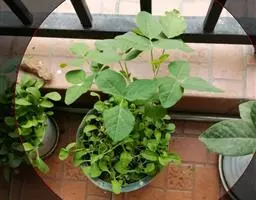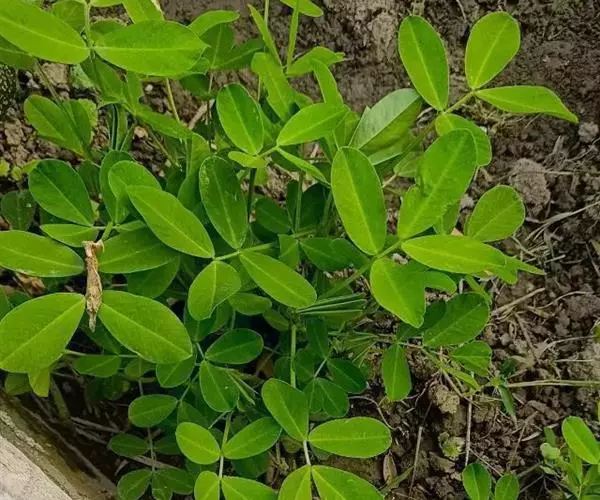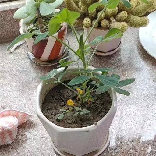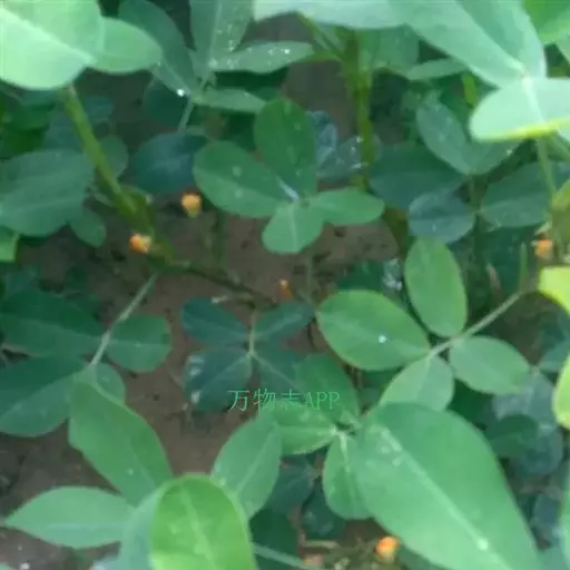 落花生(学名:Arachis hypogaea Linn.):蔷薇目、豆科,落花生属的一年生草本植物。根部有丰富的根瘤;茎和分枝均有棱,叶纸质对生;叶柄基部抱茎,卵状长圆形至倒卵形,先端钝圆形,两面被毛,边缘具睫毛;叶脉边缘互相联结成网状;花长约8毫米;苞片披针形;花冠黄色或金黄色,旗瓣开展,翼瓣与龙骨瓣分离,长圆形或斜卵形,花柱延伸于萼管咽部之外,荚果膨胀,荚厚,6-8月花果期。