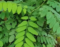 叶通常具小叶2对;托叶长2-4厘米,具纵脉纹,被毛;叶柄基部抱茎,长5-10厘米,被毛;小叶纸质,卵状长圆形至倒卵形,长2-4厘米,宽0.5-2厘米,先端钝圆形,有时微凹,具小刺尖头,基部近圆形,全缘,两面被毛,边缘具睫毛;侧脉每边约10条;叶脉边缘互相联结成网状;小叶柄长2-5毫米,被黄棕色长毛。