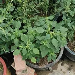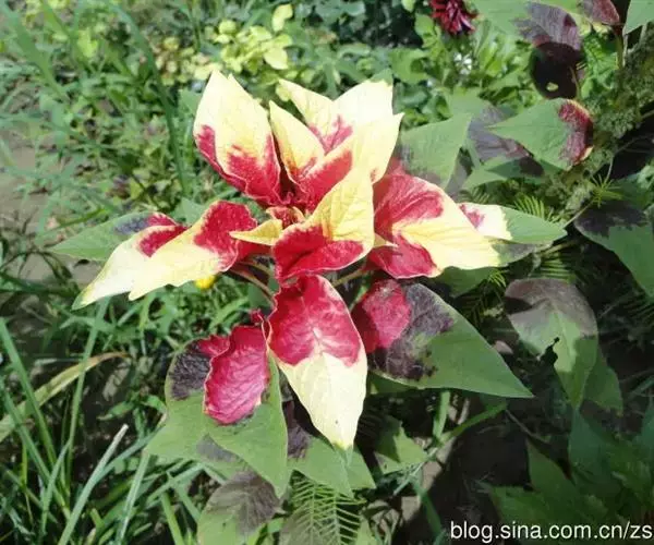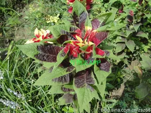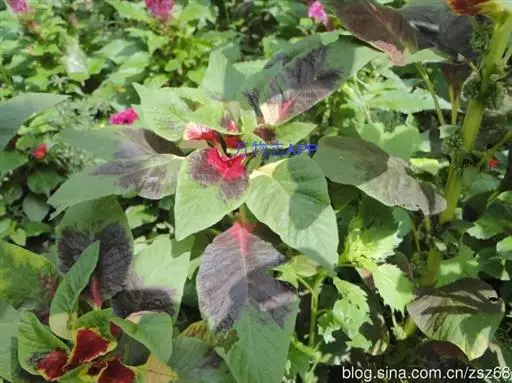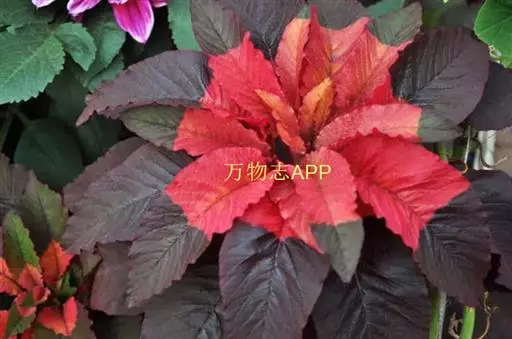 下部叶对生,上部叶互生,宽卵形、长圆形和披针形,长2-7.5厘米,顶端锐尖,基部渐狭或半抱茎,全缘,叶面有柔毛;原产地为亚洲热带地区。雁来红为苋科一年生草本植物,株高80—100厘米,茎直立,少分枝。叶互生,菱状卵形至披针形。花极小,穗状花序族生于叶腋间,种子黑色有光泽。原产印度。我国各地有栽培。